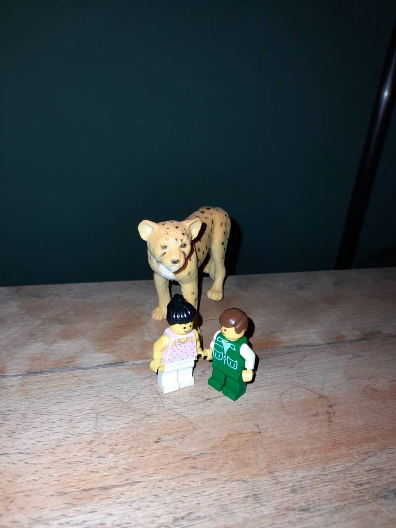 Het naast elkaar zitten is het meest veilig voor de allerkleinste delen. Ik voelde in mijn lijf, nam de tijd. En het is wonderlijk hoe dat werkt, maar je lichaam vangt signalen op van de ander. Ik voelde in mijn lijf wat zij voelde: echt helemaal verstijfd, helemaal vast, linkerkant in mijn arm, schouder en gezicht. Dat gaf ik haar terug. Toen vertelde ik welke emotie ik voelde: hulpeloosheid. Dit herkende ze helemaal; en machteloosheid. En dit raakte diep. Ze zei: dit voel ik in mijn hart, zo'n diepe pijn. Toen hebben we een hulpbron gezocht. Ze zocht een dier uit: een jachtluipaard: kracht. Die zette ze neer voor haar op tafel. Trek je naar de hulpbron, of kun je de hulpbron ook in je lijf voelen, vroeg ik? Ja, in onderbuik, heel veel warmte. Ik liet haar de hulpeloosheid opstellen. Ze koos een legopoppetje. En dit zag er heel ongemakkelijk uit. We zochten naar nog een hulpbron. Die zette ze erbij, links van het lego poppetje, en deze opstelling was rustiger. Jachtluipaard achter het lego poppetje, en de hulpbron links van het poppetje.